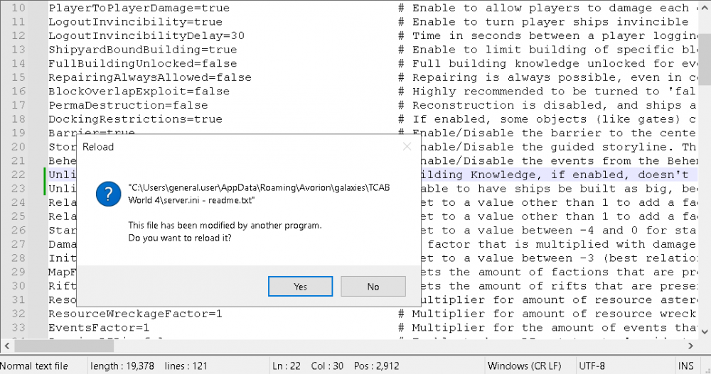 I've recently run into building issues with the 0.01 size limit being too small to work with, so I've tried going into my server.init file to reduce it. For some reason though, everytime I boot up my world the limit always resets any changes to the init variables to their default setting. According to a message that poped up and that I"ve attached below, the reset is being done by some unspecified "other program." At least one guy I spoke with said it could be caused by Onedrive, but I don't know if thats correct, why it would be doing that, or how to fix it. Thanks for any feedback.