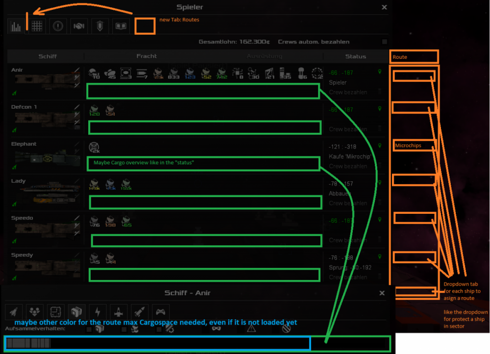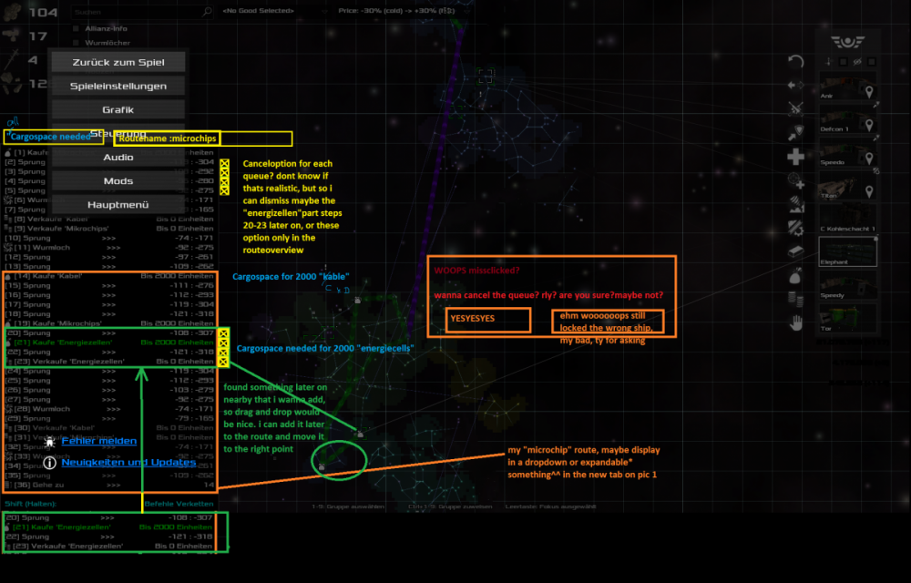 Hi there! First things first: Awsome Game. Thank you! Thanks to Mrs. and Mr. backer (Kickstarter xD)! Second: i ll try my best in english. Some ideas: I think it would be nice to rearrange the queue for the ships with a captain for maybe a trade route (queue/loop). 1. 1. If the ship has a queue already, just ask: do i wanna cancel the queue?! Sometimes i forget to „unclick“ the current ship and i have to set up the loop again. Woooops…:: "captain from the *shipname*, sir you've first said do this and do that and then this and by microchips etc, and now??? srly?" me: " Do what i say, i pay your rent" or "sry wrong number" 2. 2. Drag and drop for a long Loop (queue orders) – so you can add some route after that and put it in the right place 3. 3. Cancel some orders in a queue 4. 4. Name a Route so i can put other ships on it, „routename“ – maybe :they have to be on the route or they wouldnt start it, and may i can put some routes later on together if they fit (point 2+4) 5. 5. If i have buy orders on the route, show me the cargo ive need on the ship – i wanna buy 2000 microchips (2000x loadingspace) etc for the hole route Sometimes pics are better ;D feel free to use, ask, adjust, im excited and a bit nervous ;D My first response to a game. Greetings from Germany. Have a nice day!! (....yes paint, and print button....xDDD, translation: if i write do this and do that, i wanna do this, or it should be so- i mean, it would be a nice to have^^ dont wanna be impolite, in deutsch würde ich es höflicher umschreiben^^)